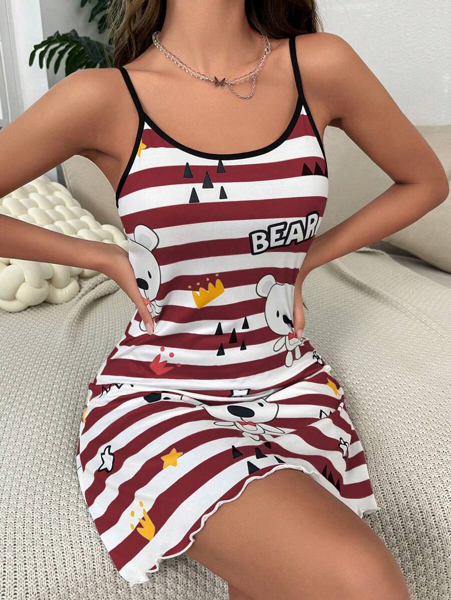 Striped & Cartoon Graphic Contrast Binding Lettuce Trim Cami Nightdress