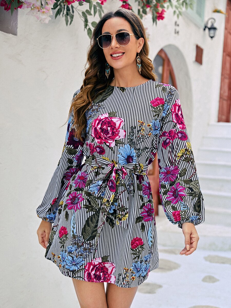 SHEIN Clasi Striped & Floral Print Lantern Sleeve Belted Dress