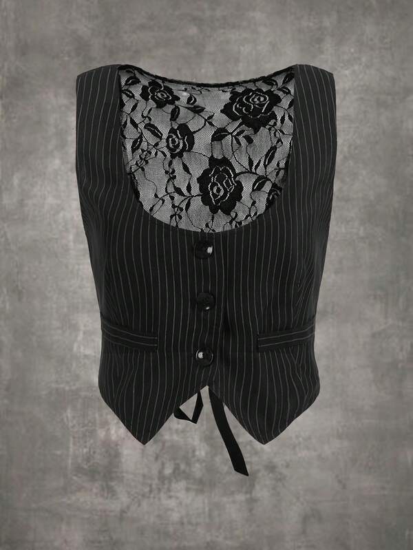 ROMWE Grunge Punk Striped Contrast Lace Vest Jacket