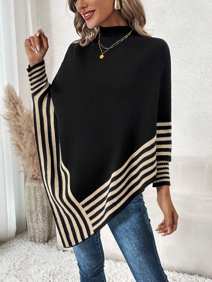 SHEIN Clasi Striped Pattern Batwing Sleeve Asymmetrical Hem Poncho