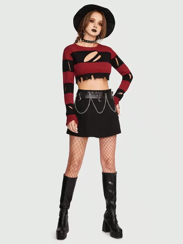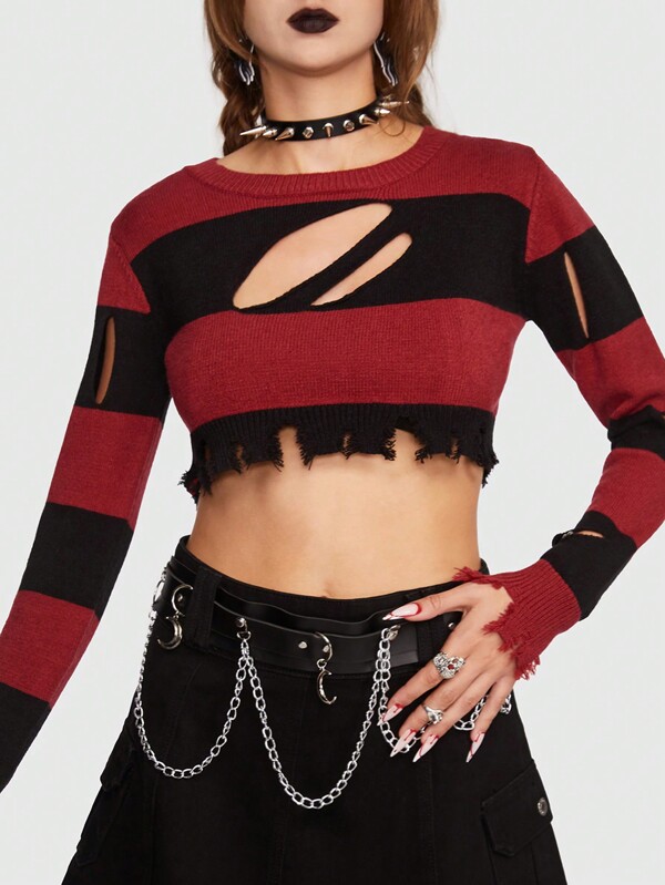 ROMWE Goth Striped Pattern Cut Out Front Crop Sweater