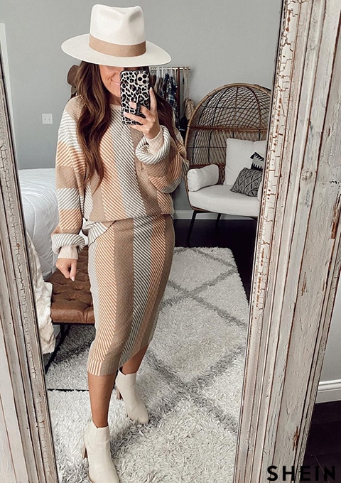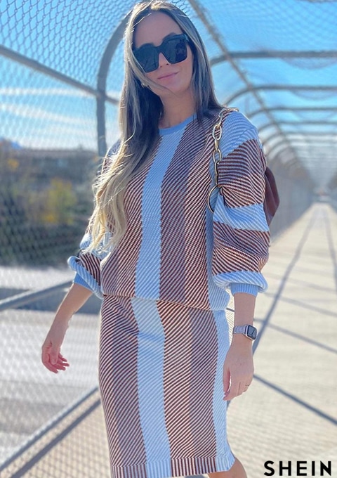 SHEIN Mulvari Striped Pattern Drop Shoulder Sweater & Knit Skirt