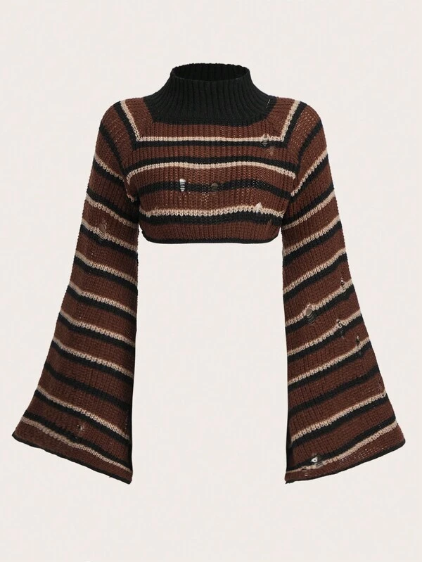 ROMWE Fairycore Striped Pattern Mock Neck Bell Sleeve Crop Sweater