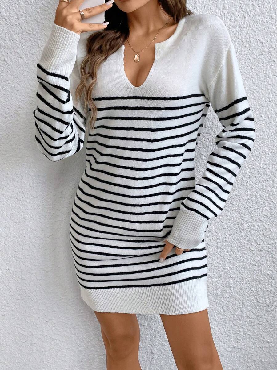 SHEIN Frenchy Striped Pattern Notched Neckline Drop Shoulder Sweater Dress