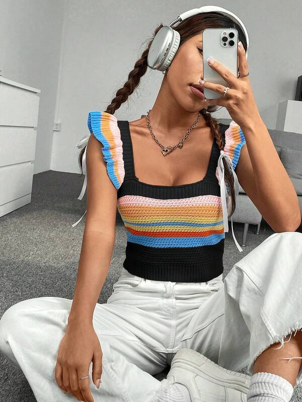 SHEIN Qutie Striped Pattern Ruffle Trim Knit Top