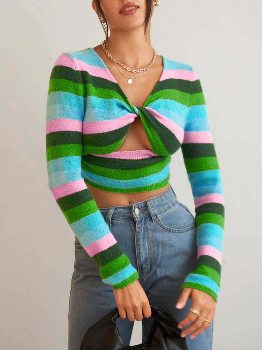 SHEIN Essnce Striped Pattern Twist Front Cut Out Crop Sweater
