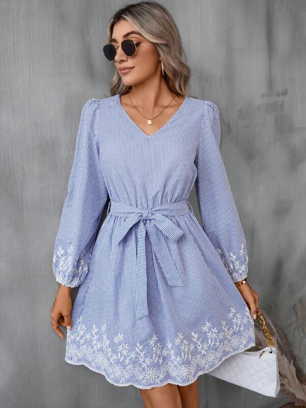 SHEIN LUNE Striped Print Embroidery Floral Lantern Sleeve Belted Dress