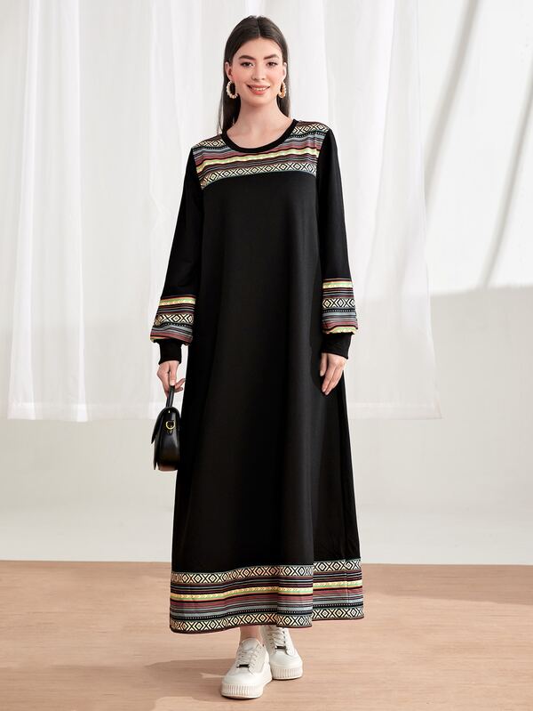 SHEIN Mulvari Striped Print Lantern Sleeve Sweatshirt Dress
