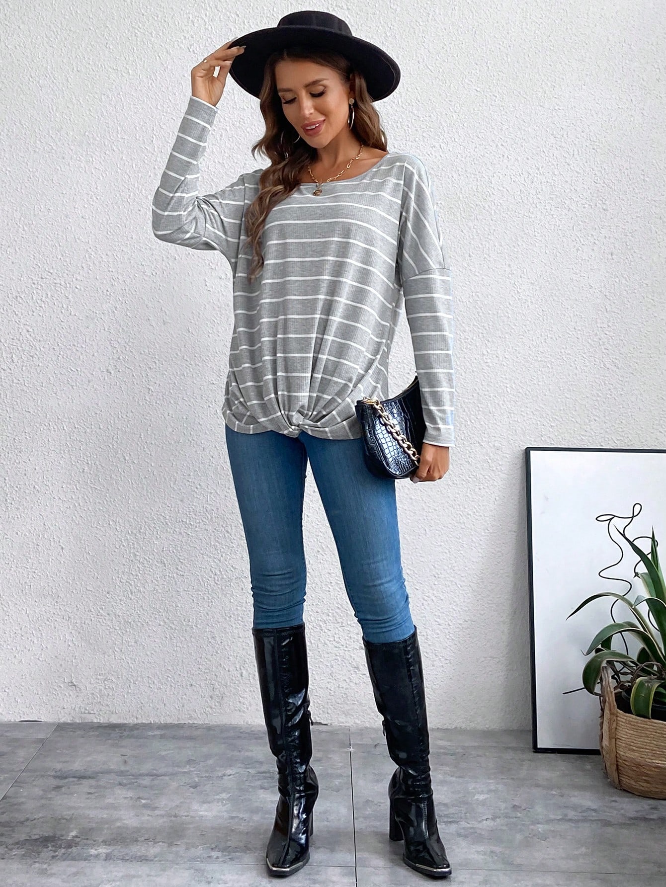SHEIN LUNE Striped Print Twist Hem Tee