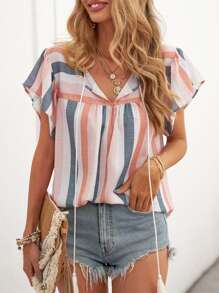 SHEIN VCAY Striped Tie Neck Butterfly Sleeve Blouse
