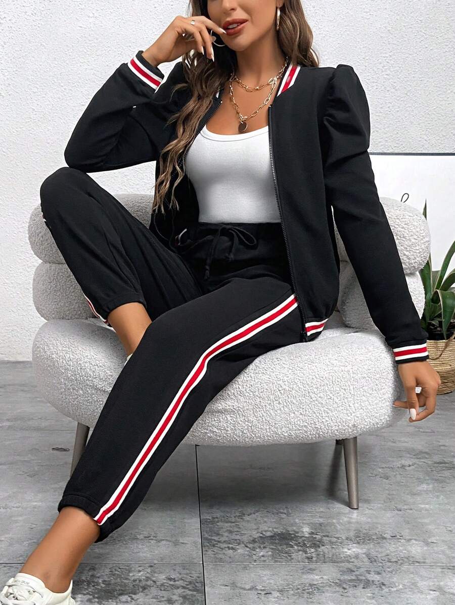 SHEIN LUNE Striped Trim Puff Sleeve Bomber Jacket & Drawstring Waist Sweatpants