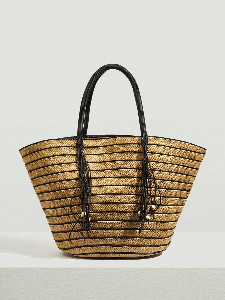 SHEIN VCAY Stripped Large Capacity Straw Bag Tassel Decor Shoulder Tote Bag For Vacation