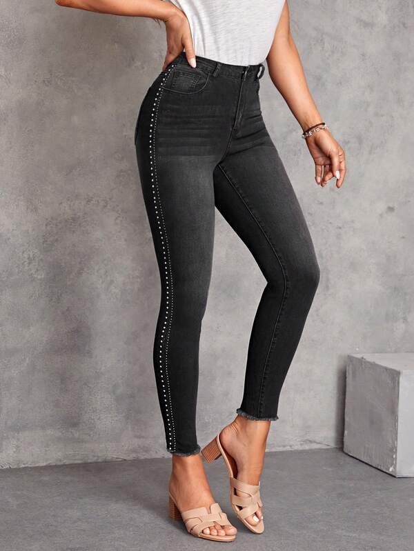 SHEIN LUNE Studded Detail Raw Hem Skinny Jeans