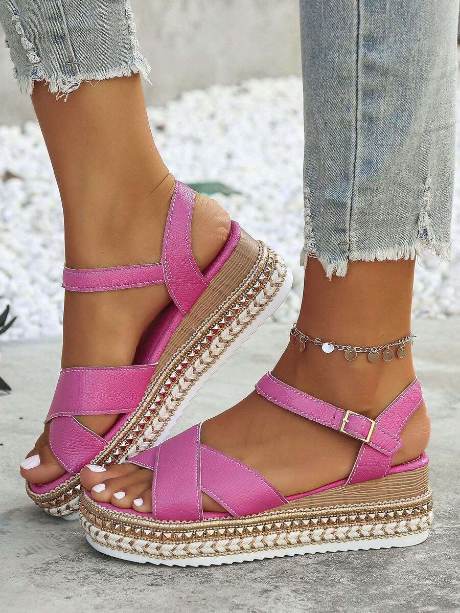 Summer Fashionable And Comfortable Versatile Leaky Toe Increased Fluorescent Pink Sandals Women's Wedge Heel Thick-soled Sandals