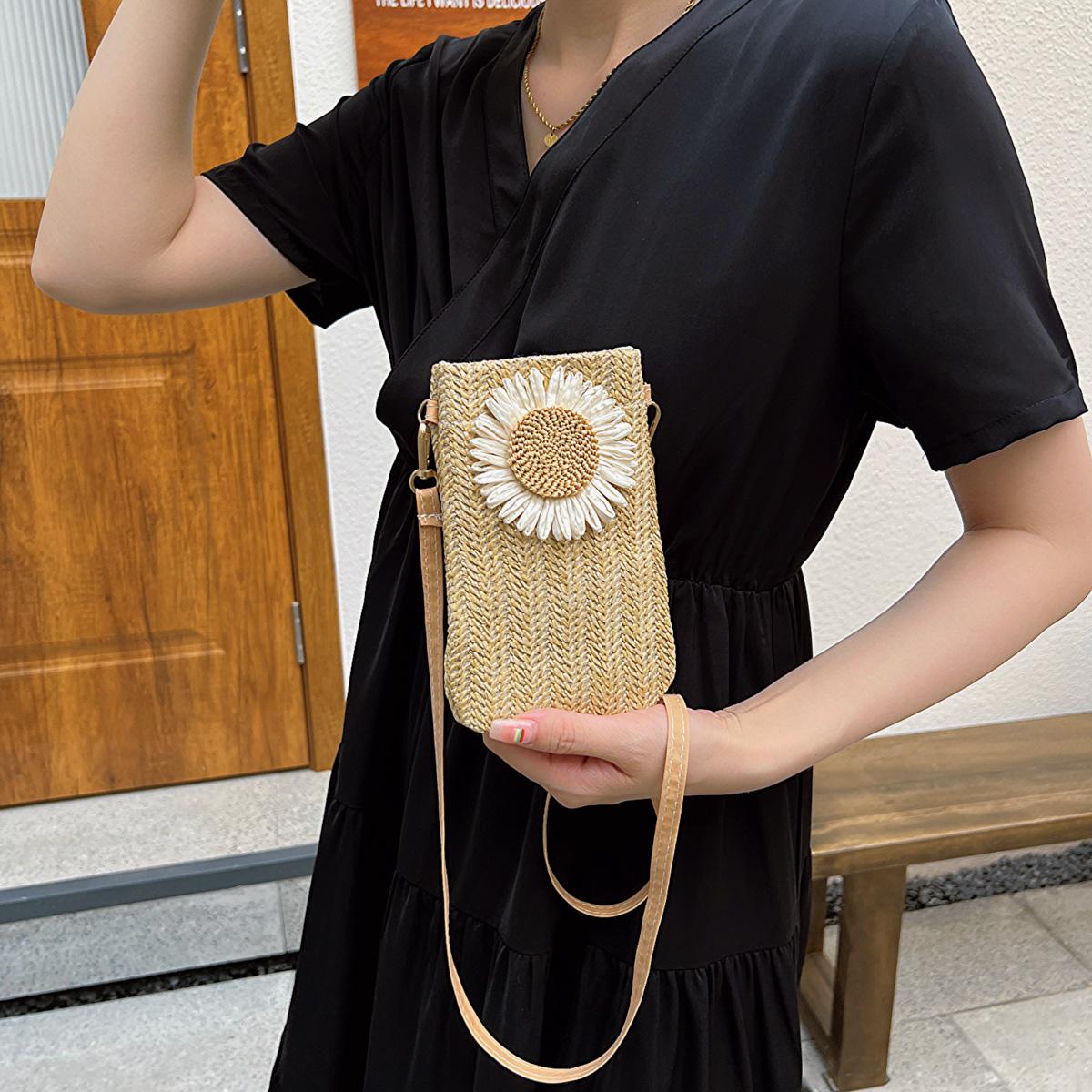 Summer Woven Bag Crossbody Bag With Sunflower Decoration For Phone Lightweight,Fashion White-Collar Workers College,Work, Business, Commute,Office,For Anniversary,For Lover,For Birthday Gift,On Valentine Day Gift, Gift