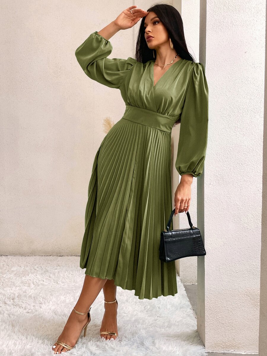 Surplice Neck Bishop Sleeve Pleated Hem Dress