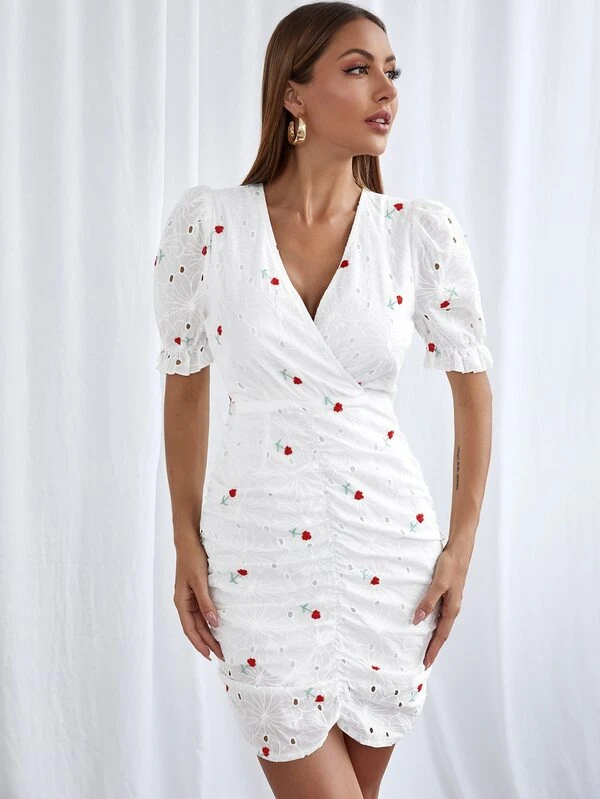 SHEIN Unity Surplice Neck Floral Embroidery Ruched Schiffy Dress