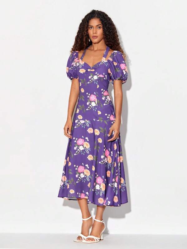 NOUF MATER Sweetheart Neck Puff Sleeve Floral Print Dress