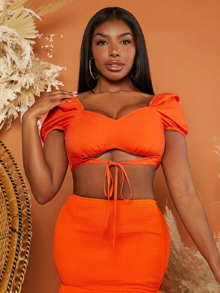 SHEIN Slayr Sweetheart Neck Puff Sleeve Knot Front Crop Top