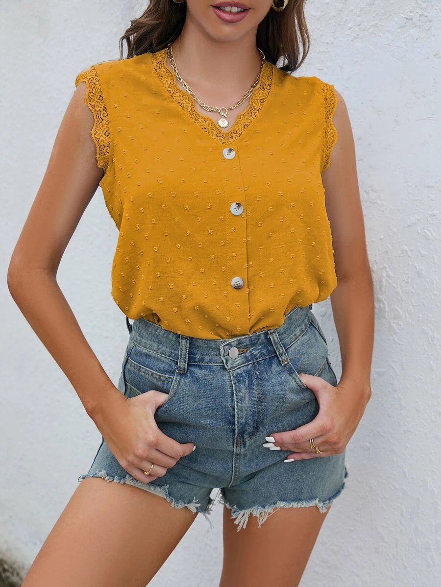 SHEIN Unity Swiss Dot Contrast Lace Scallop Trim Blouse