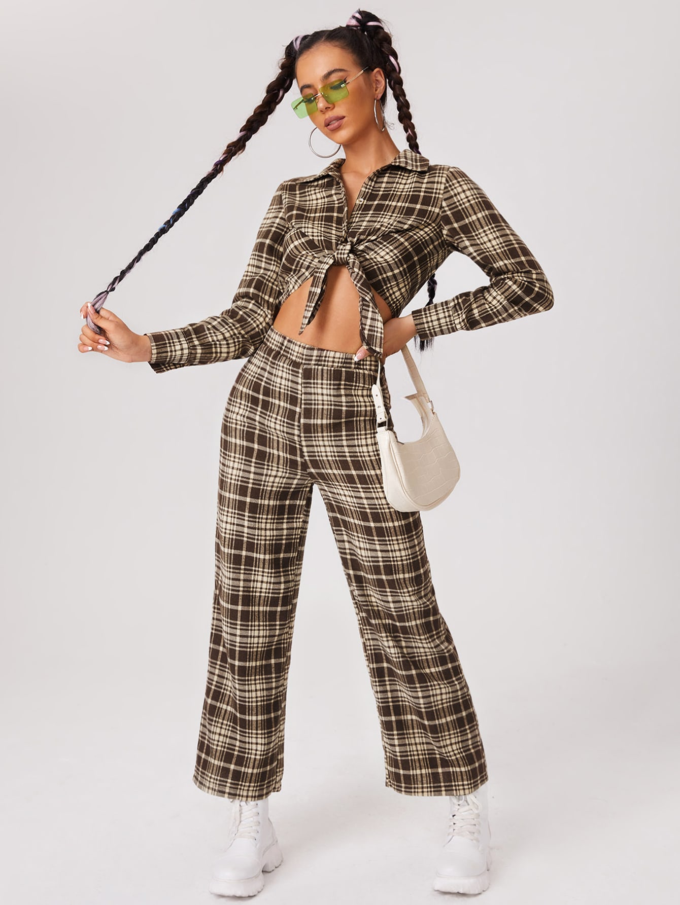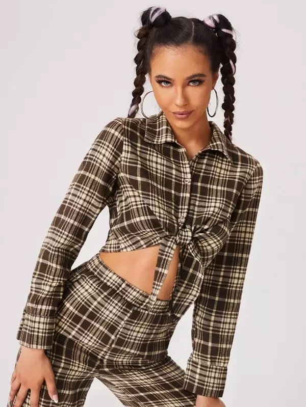 SHEIN EZwear Tartan Print Tie Front Crop Shirt