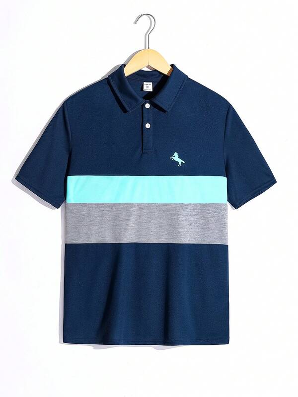 SHEIN Teen Boys' Comfortable Casual Short Sleeve Polo Shirt With Printed & Color Block Design