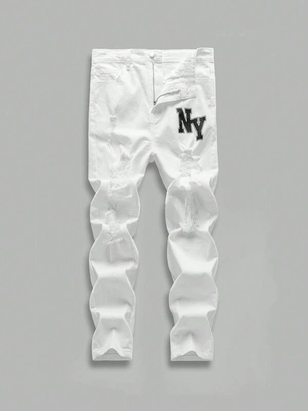 Teen Boys' New Casual Fashionable Water Washed Slim Fit Jeans With Printed Patch And Distressed Details