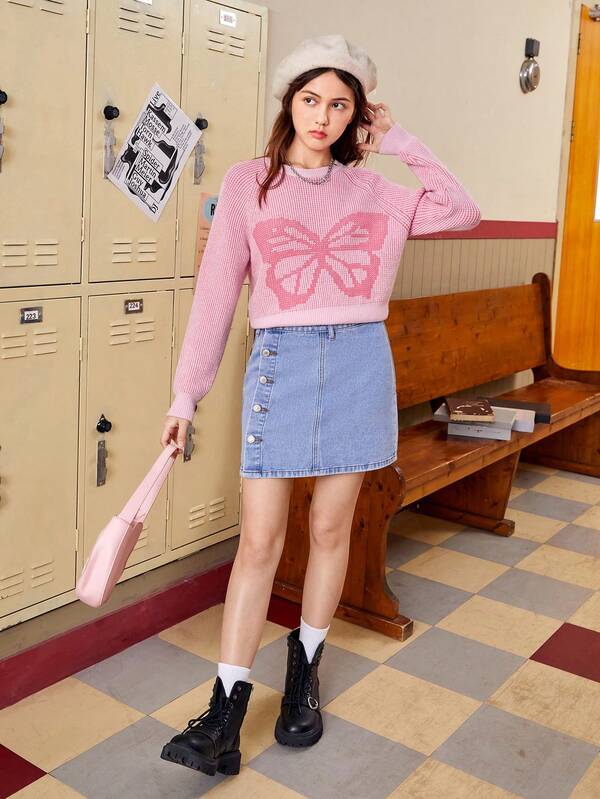 Teen Girl Butterfly Pattern Raglan Sleeve Sweater