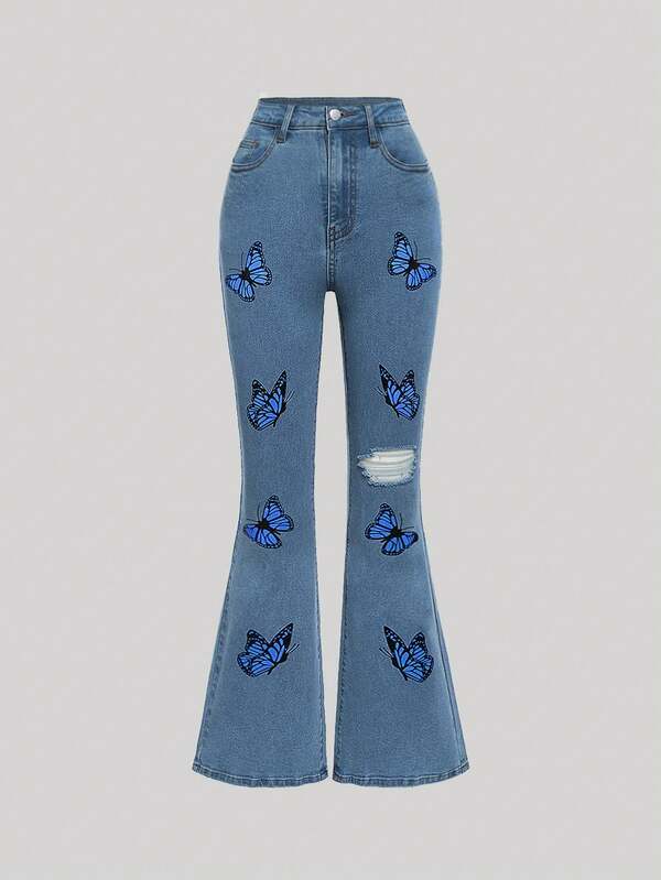 SHEIN Tween Girl Butterfly Print Ripped Flare Leg Jeans