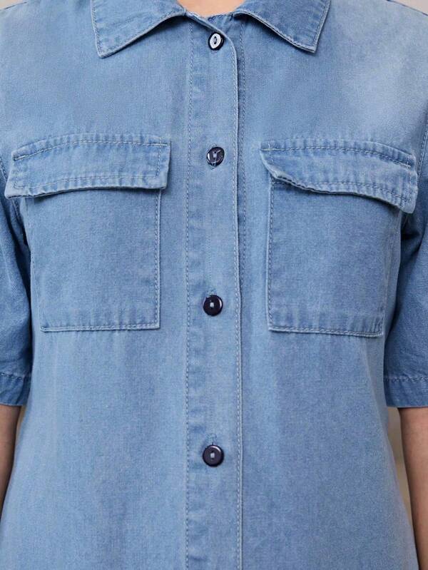 Teen Girl Flap Pocket Ruffle Hem Denim Dress