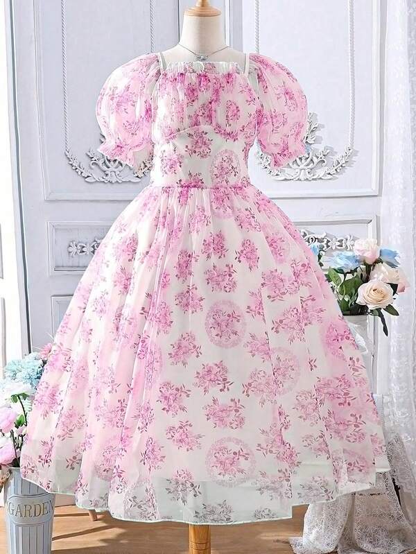 SHEIN Teen Girl Floral Print Puff Sleeve Organza Overlay Dress
