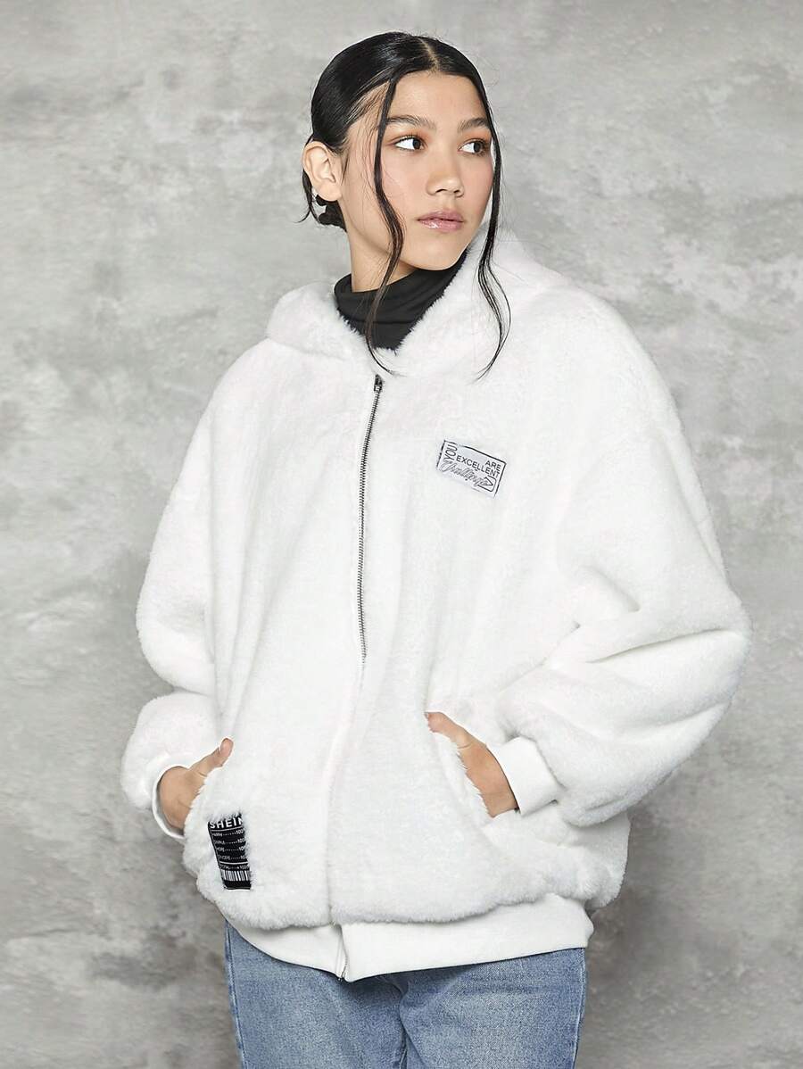 Teen Girl Letter Patched Drop Shoulder Hooded Teddy Jacket