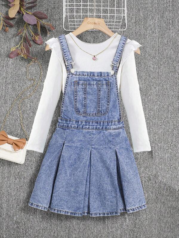 Teen Girl Patched Pocket Pleated Hem Denim Overall Dress Without Tee
