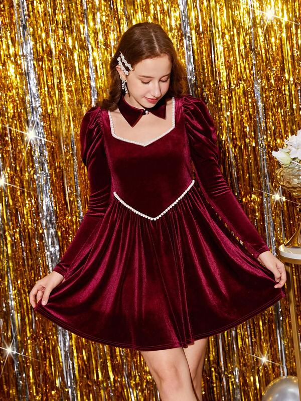 Teen Girl Rhinestone Detail Gigot Sleeve Dress With Bow for Christmas
