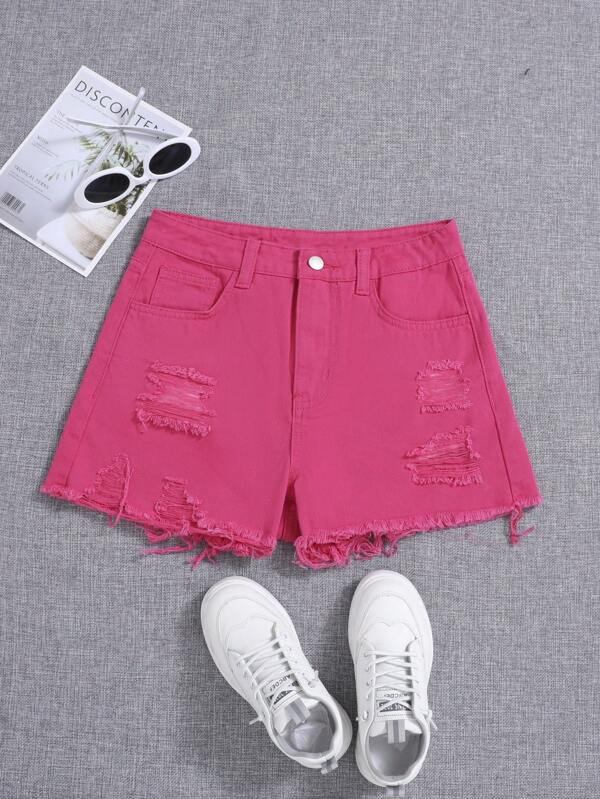 SHEIN Teen Girl Ripped Raw Hem Denim Shorts