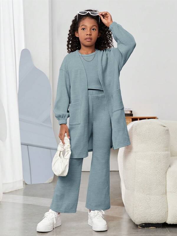 SHEIN Kids Cooltwn Tween Girl Solid Drop Shoulder Coat & Tank Top & Pants