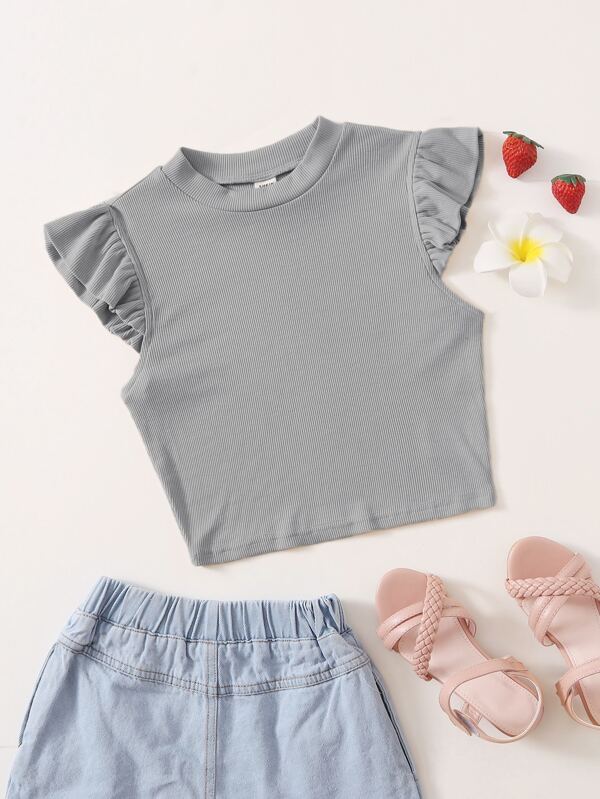 SHEIN Teen Girls' Fitted Ribbed Knit T-Shirt With Ruffle Hem And Round Neckline