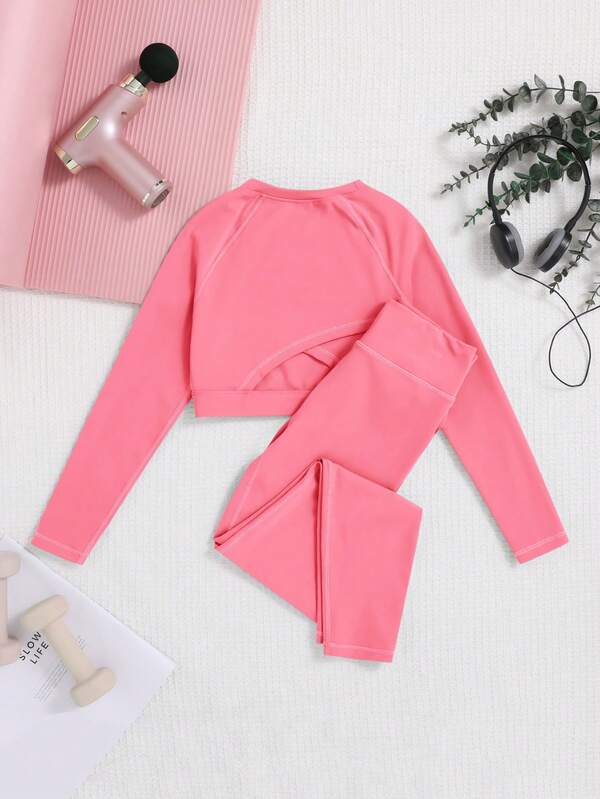 SHEIN Teen Girls' Hollow Out Back Round Neck Drop Shoulder Sleeve T-Shirt And Long Pants Sports Set
