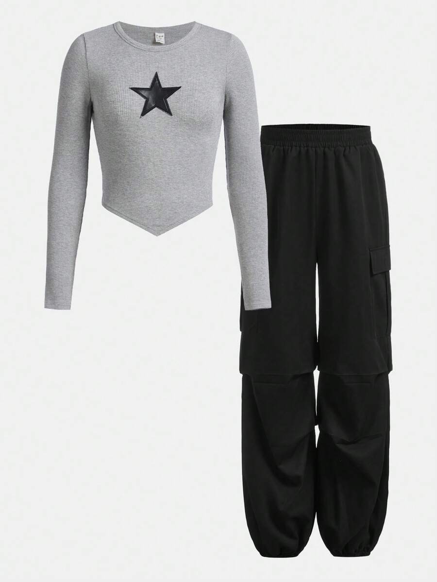 SHEIN Teen Girls' Knitted Ribbed Star Pattern T-Shirt And Pleated Cargo Pants Outfit, 2pcs/Set