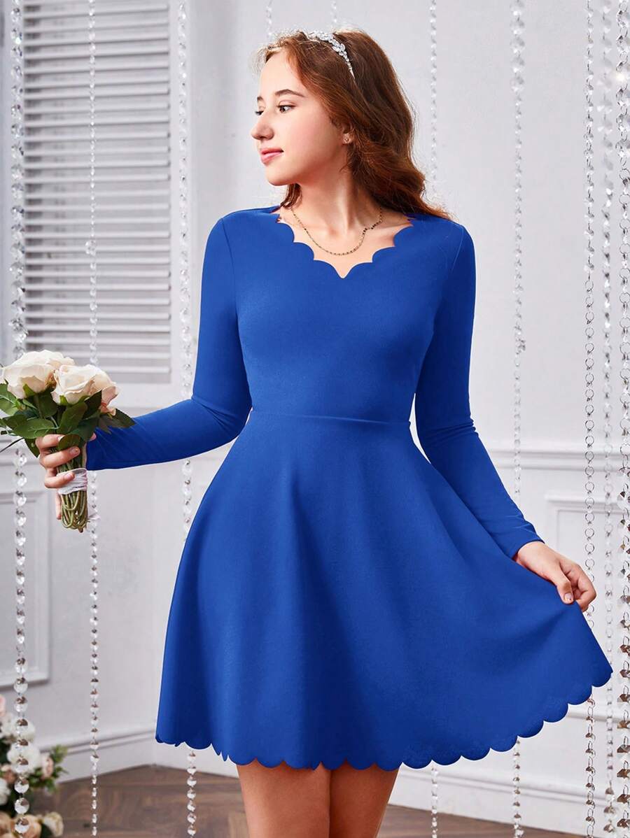 SHEIN Teen Girls' Knitted Solid Color Wave & Burn-Out Flower Pattern Casual Long Sleeve Dress