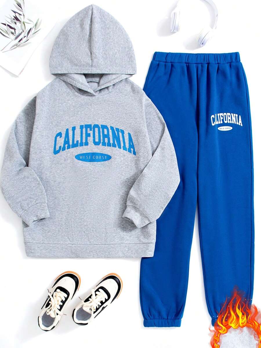 Teen Girls' Letter Printed Hoodie And Sweatpants Suit