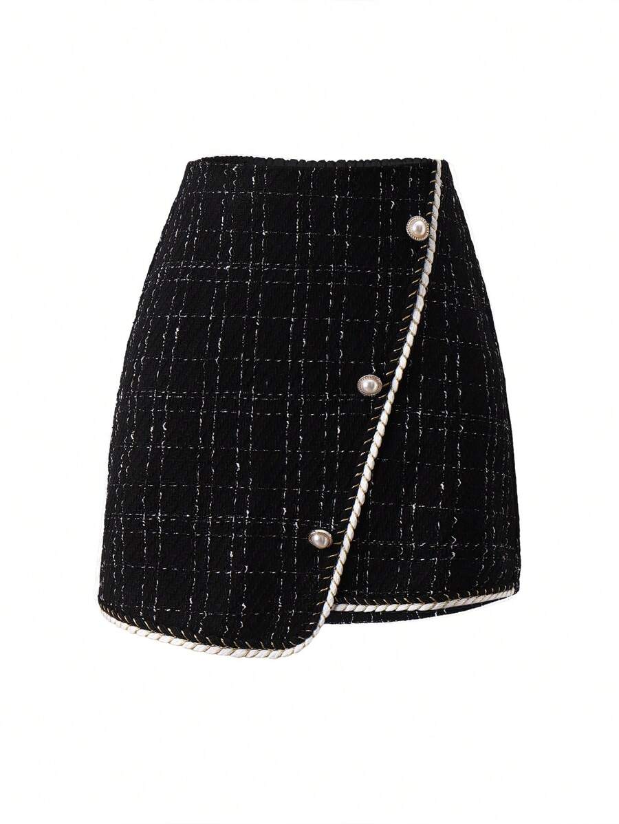 Teen Girls' Plaid A-Line Skirt With Diagonal Button Decor