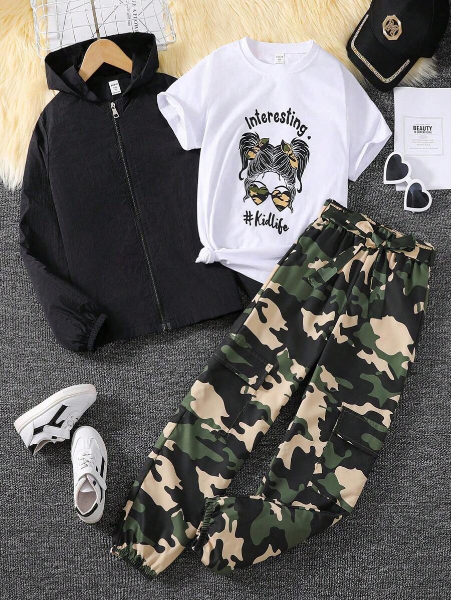 Teen Girls' Printed Short Sleeve T-shirt, Zipper Jacket And Camouflage Pants Set