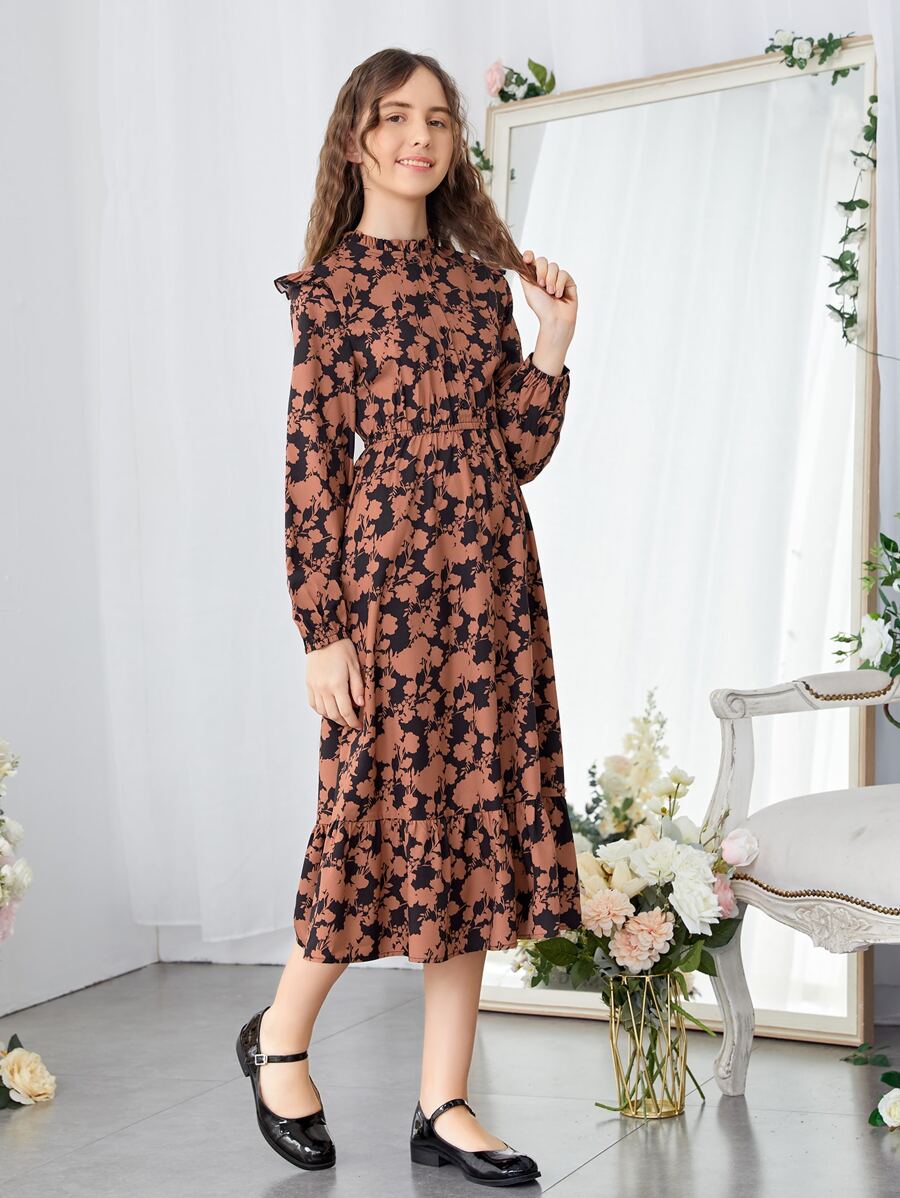 SHEIN Teen Girls Allover Floral Print Frilled Neck Ruffle Hem Dress