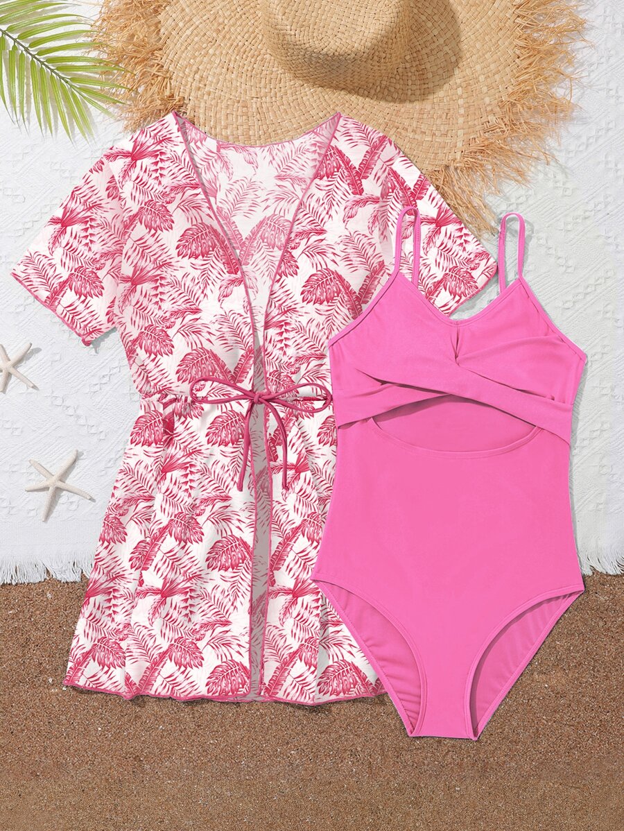 SHEIN Teen Girls Cut Out One Piece Swimsuit With Tropical Print Kimono