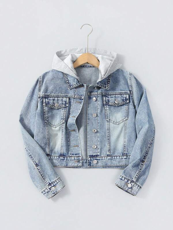 Teen Girls Flap Pocket Hooded Denim Jacket