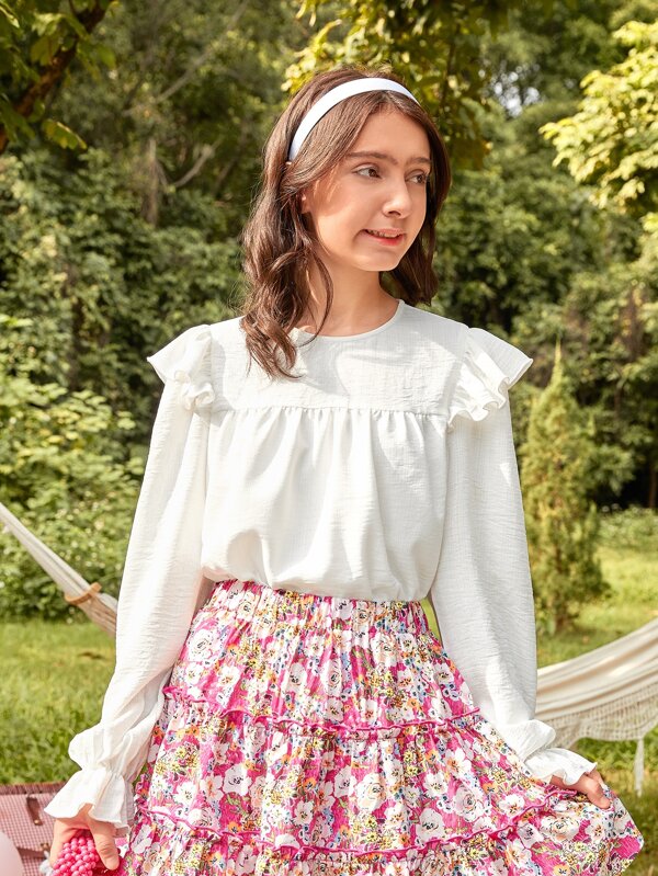 SHEIN Teen Girls Keyhole Back Ruffle Trim Flounce Sleeve Blouse
