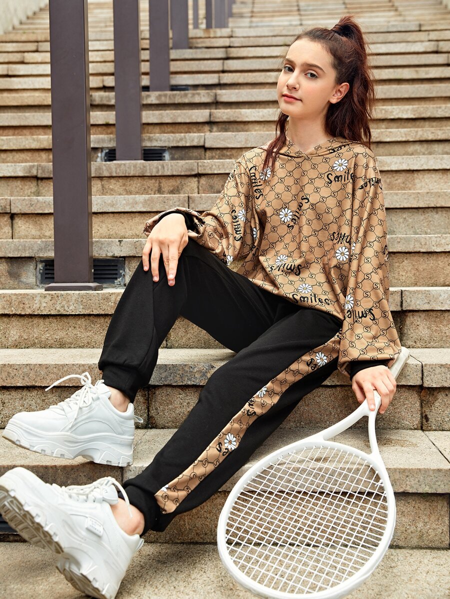 SHEIN Teen Girls Letter & Floral Print 1pc Hoodie & Contrast Binding 1pc Sweatpants