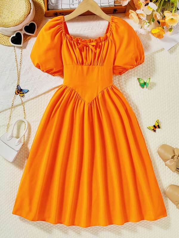 SHEIN Teen Girls Ruched Bust Puff Sleeve Dress