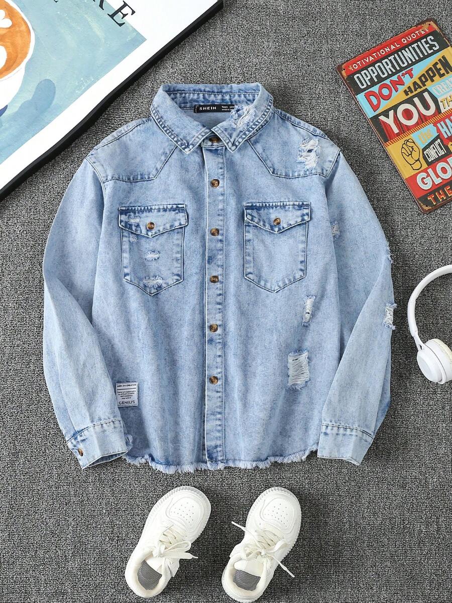 Teenage Boys' Casual Street Style Ripped Denim Jacket